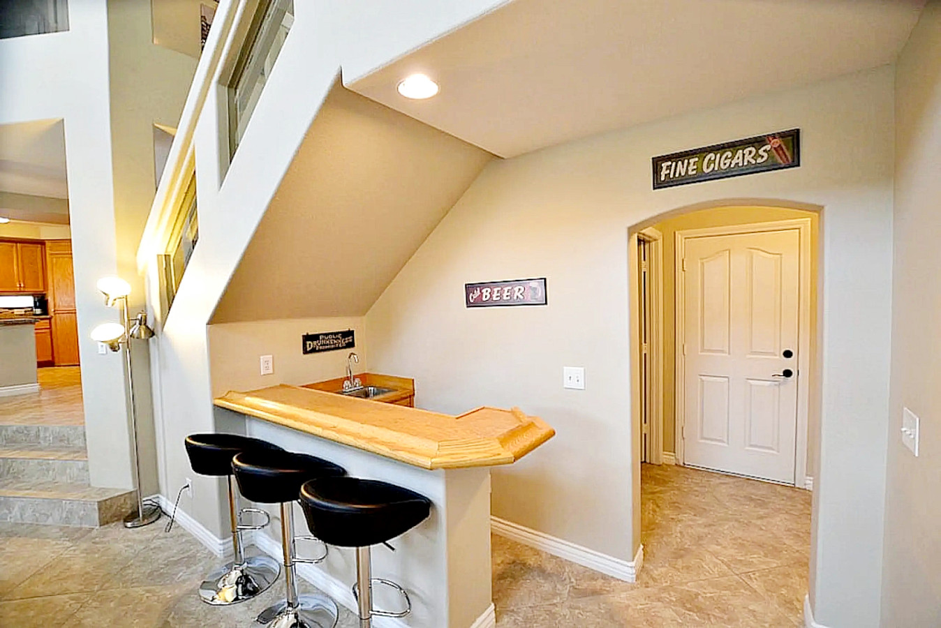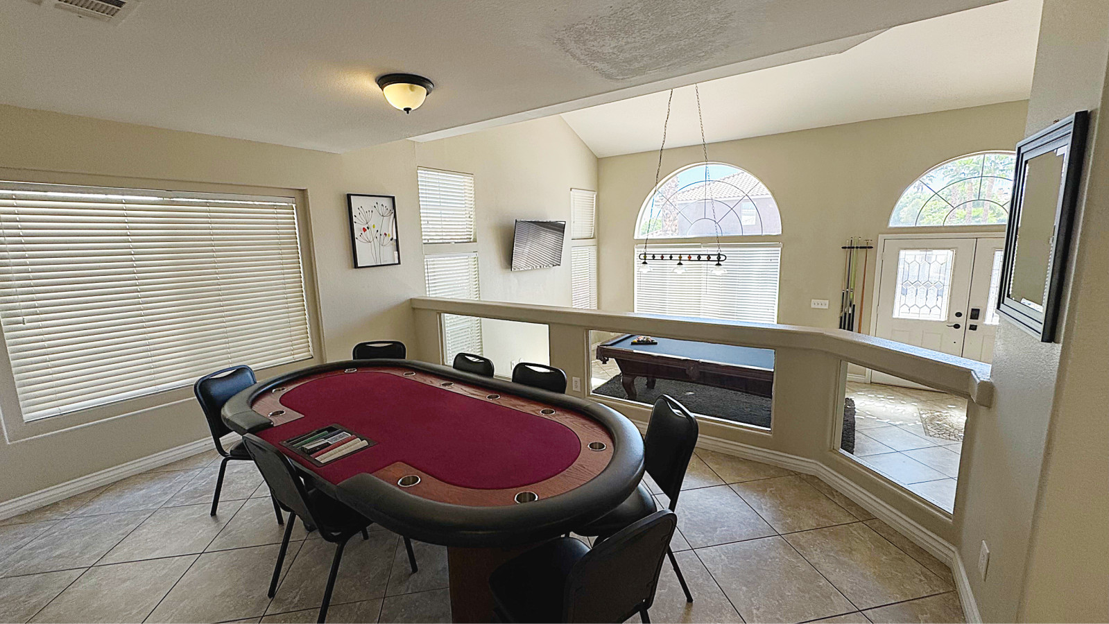 Upon entering, you step into one of two game rooms. The first has a pool table, and the second features a full size poker table- which overlooks the billiards area. The open, and spacious kitchen is perfect for cooking a large meal, while enjoying the company of your guests. The kitchen opens to the dining area and also overlooks the living room, complete with pool views, and large windows. The living room shows off cozy leather couches, a 55 inch TV, and wet bar. On the first level, you will also find a bedroom with outdoor access through French doors, a full bathroom, and a laundry room.