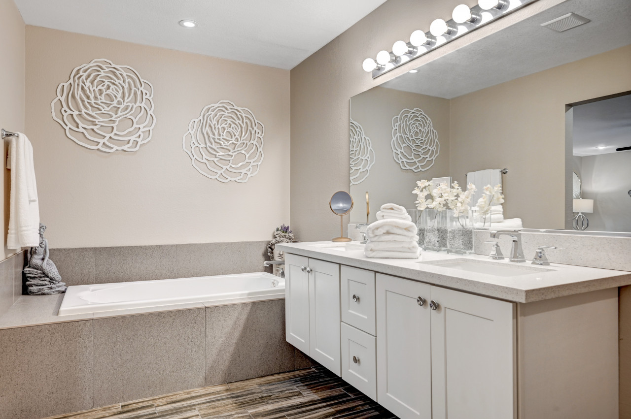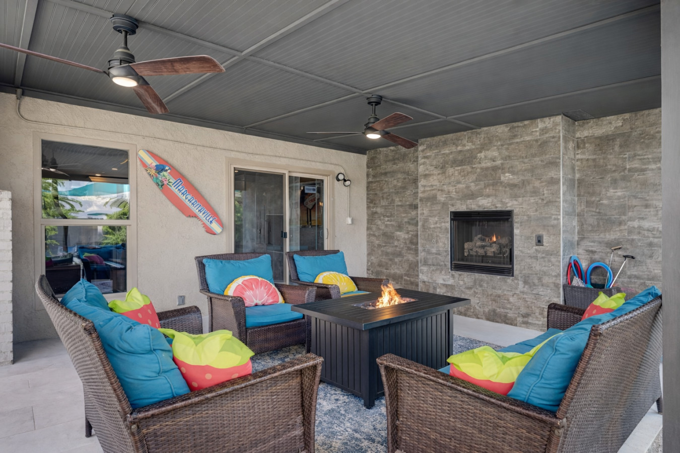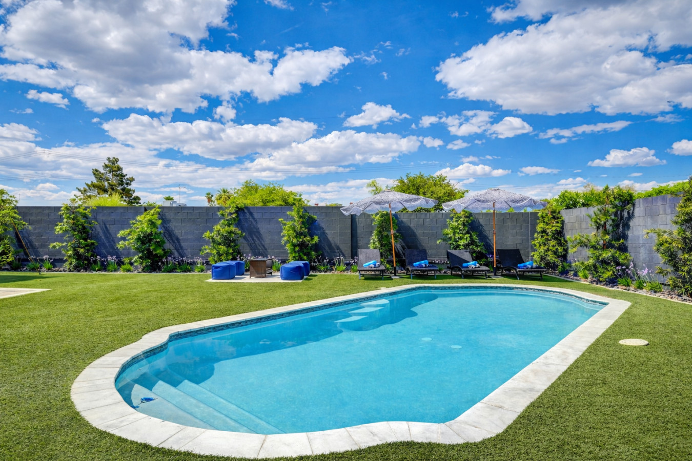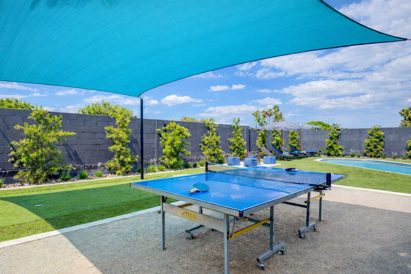 Your private outdoor retreat includes: • Heated private swimming pool • Color-changing LED pool lights • 3-hole putting green • Pool volleyball court • Covered patio with seating • Fire pit & fireplace • BBQ grill • Beach sand play area with ping pong & cornhole • Tall block walls for maximum privacy